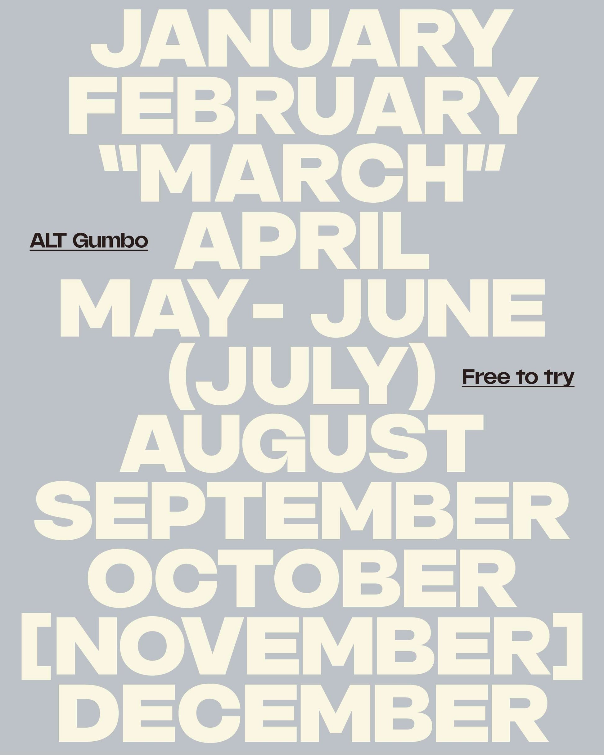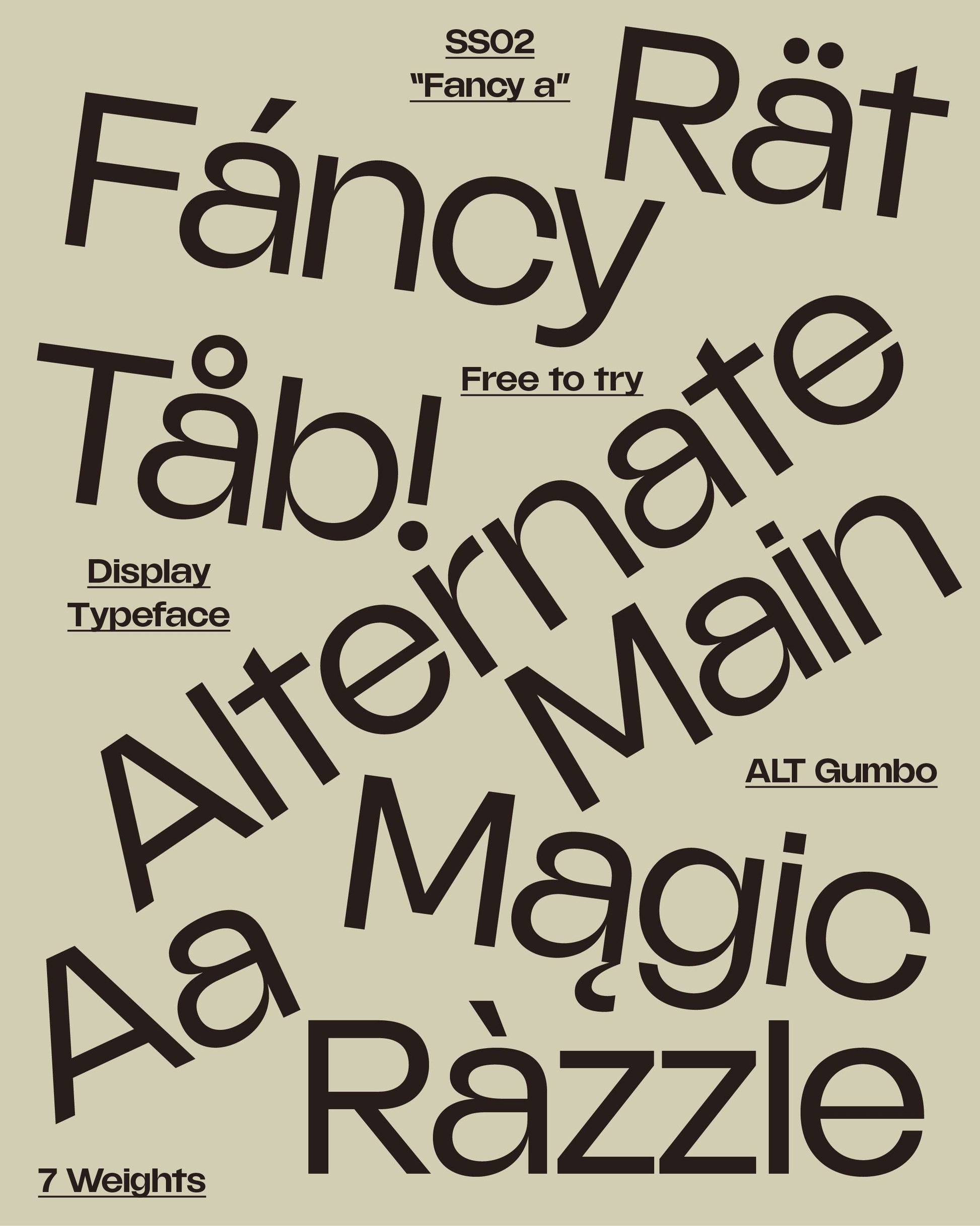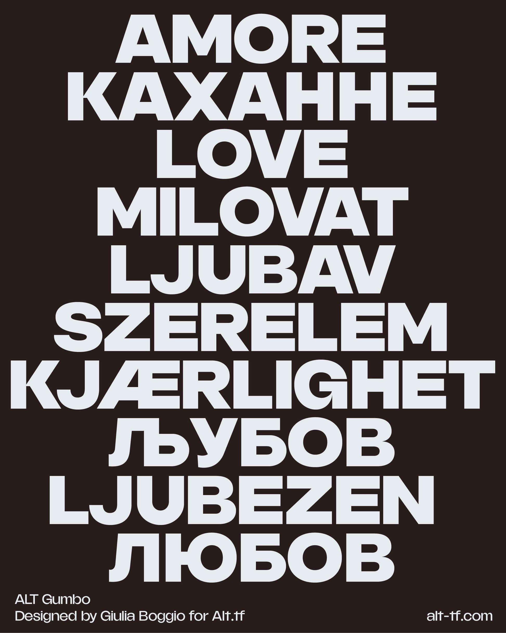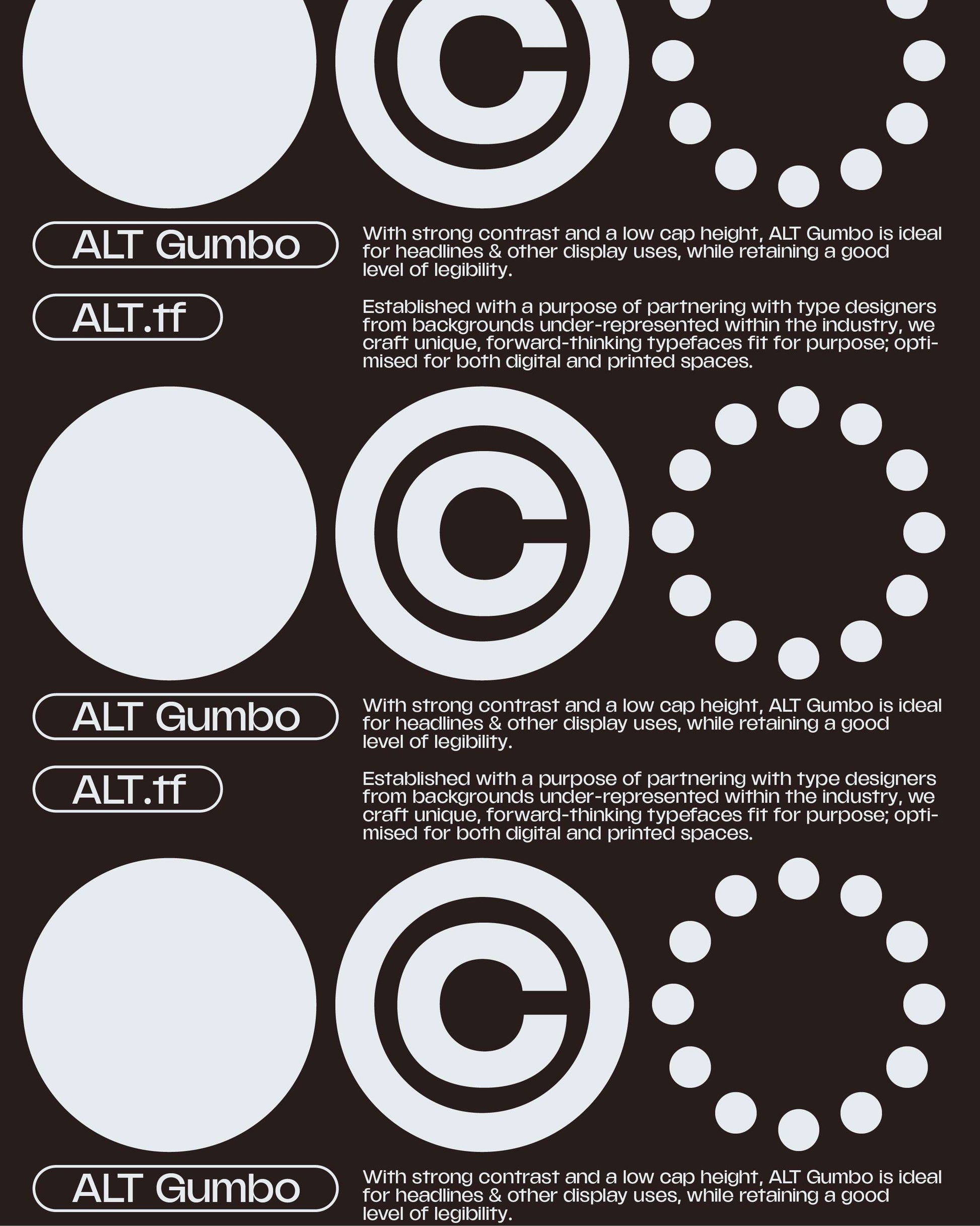 A high contrast neo-grotesque, ALT Gumbo is well-suited for the contemporary needs of digital and printed typesetting. Balancing versatility and style, sporting short ascenders and equally short descenders, ALT Gumbo performs wonderfully when line height is set quite snug.