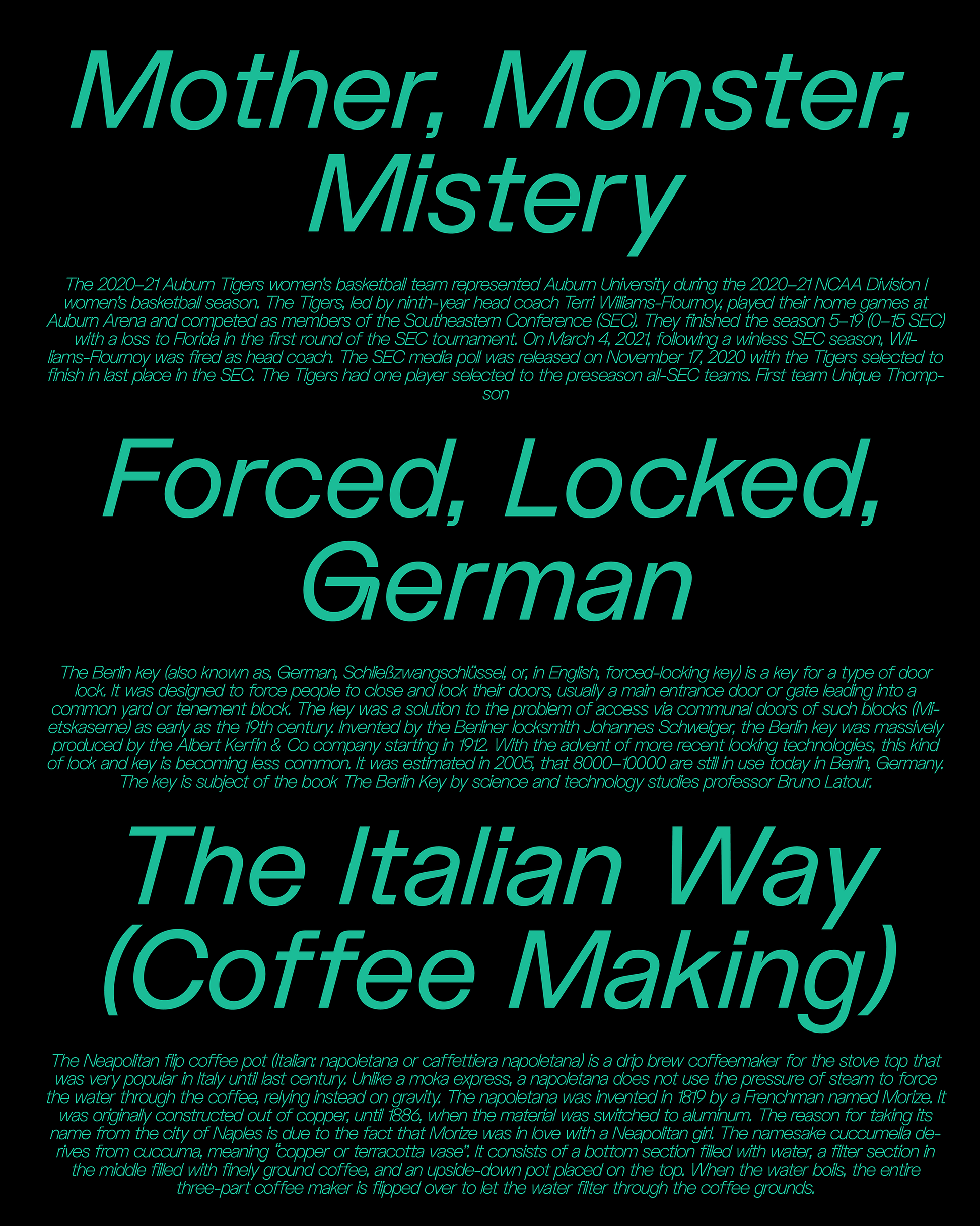 Infused with a valiant sense of character, type designer Giulia Boggio (she/they), enjoyed pitting ‘hard’ against ‘soft’ forms. In particular, they emphasise the hard shoulders of R, G, and f. “It’s really satisfying to me to look at the contrast between sharp and soft,” they say, “it’s like they’re fighting initially but no one can win so they end up making it work.”